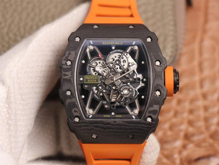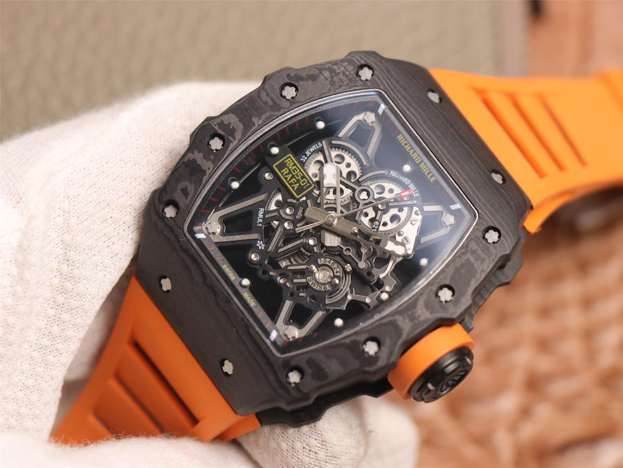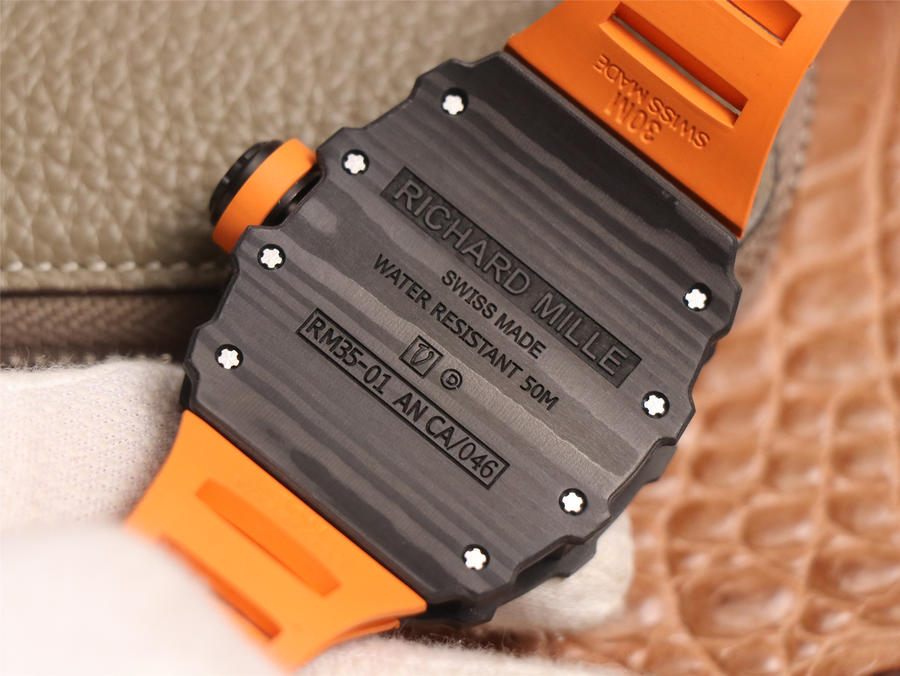 NT全新的RM035-01密底n全新改進了碳釬維殼,讓整體的紋路無限接近專櫃 避震器改成鑲嵌透明碎鉆一顆。n錶帶頭粒原版開模,錶帶的扣位小眼,可以和專櫃互換,讓佩帶更加舒適。n贈送1副備用膠帶+理cha德原廠專用螺絲刀+2個把頭多色膠環(可手拆)。