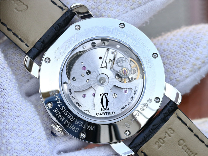 卡地亞CartierRONDE LOUIS CARTIER繫列機械男錶:超薄,直徑40厚度8MM,原裝卡地亞9916MC型工作坊精制自動上鏈機械機芯,透過錶底清晰可見。一致夾闆刻字,機芯穩定!藍寶石水晶鏡面,原裝比例細節!特別註重手錶的大小,弧度,拋光,刻字! 外殼均採用真空電鍍,特別是白金款式光亮不掉色,純正316進口鋼材使整錶更有墜感,歡迎比對!雙面鱷魚皮!!!原裝扣! 三十米防水!